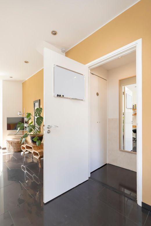 Het woongedeelte loopt door in een open hoogglans witte keuken met een vaatwasser, oven en combimagnetron. Op de begane grond bevindt een toiletruimte met zwevend toilet en voorraadkast.